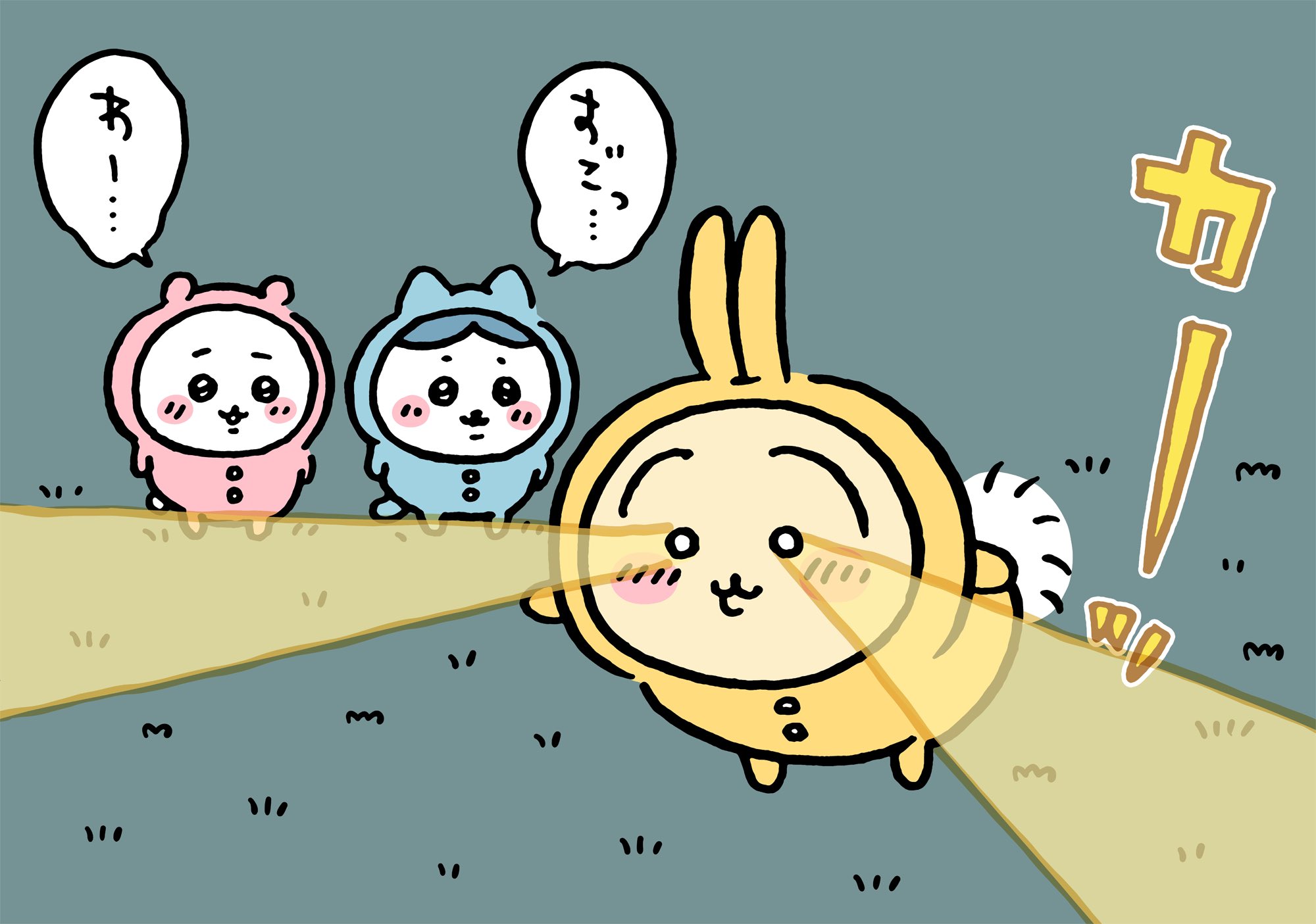 ハチワレがちいかわに「草むしり検定」の問題を出していたところ、横からうさぎが答えて3級の実力を見せつけています😏あと、一瞬でパジャマを脱ぐ技(?)がすごい😮