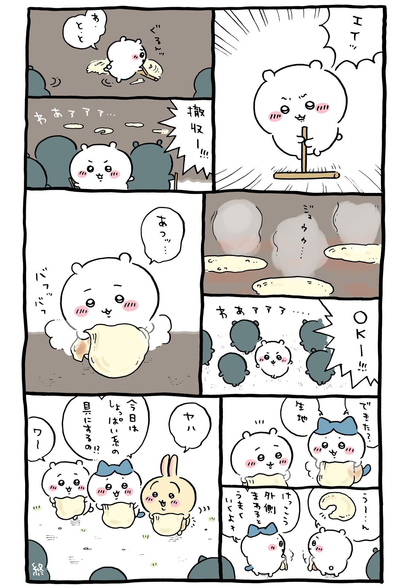 生地を鉄板から剥がすところもすごく丁寧に描かれていました。ハチワレに出来を聞かれたちいかわですが、一部欠けちゃったので微妙な反応です😅