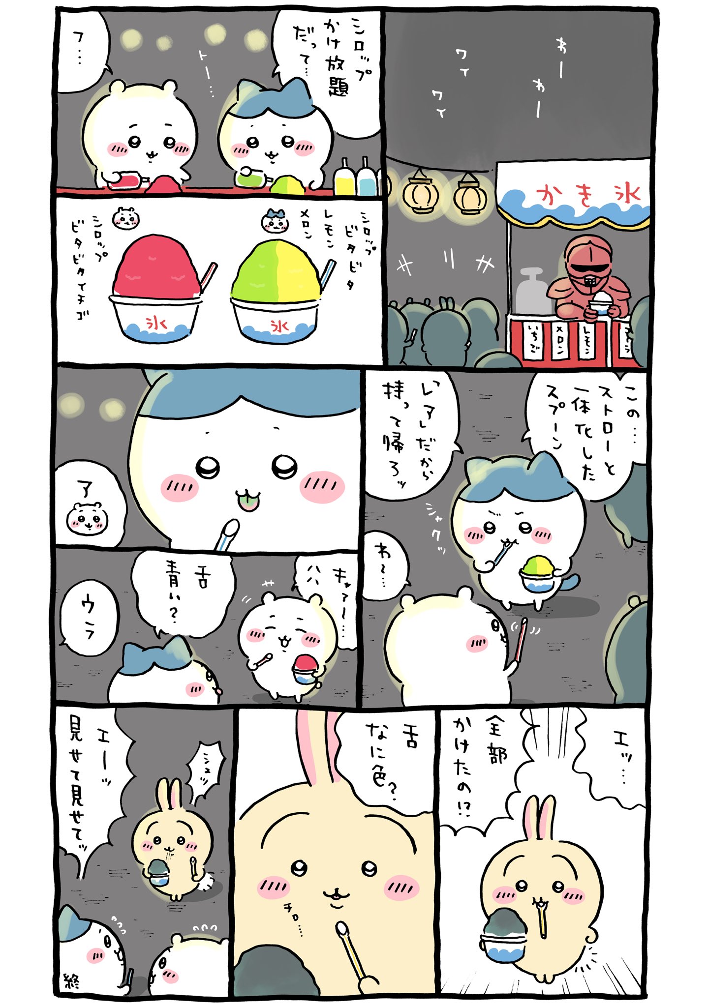 かき氷を食べる時にしかお目にかかることのないこのストロー、ハチワレは好きそうですよね(笑) クルクル回してみるちいかわの描写がすごくよかったです。青くなった舌で盛り上がるのもかき氷の定番ですね!
